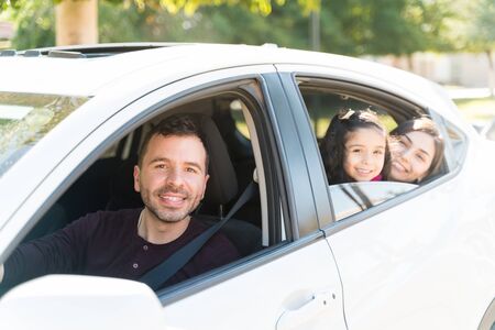 latin hispanic man and beautiful woman with cute daughter ready for trip on car