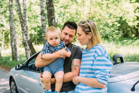 Mom, dad and little son in a convertible car. Summer family road trip to nature