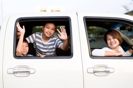 Happy Asian Thai family of mother and son in a car traveling on a road during summer vacation.