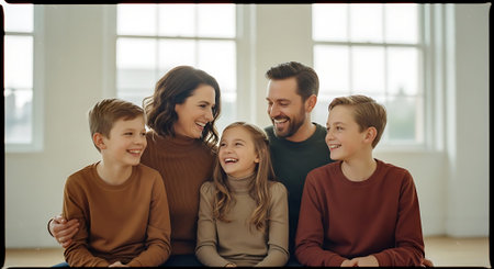 A joyful family of five, including parents and three children, sitting close together and laughing in a bright, warm living room.
