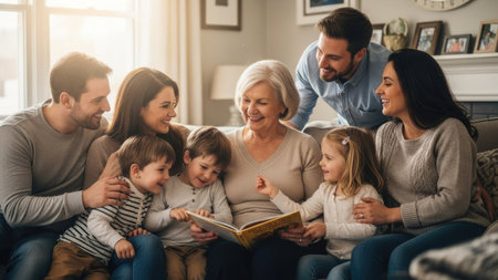 A multigenerational family is gathered indoors, possibly in a living room, engaged in reading a book together. Warm lighting illuminates the scene. The composition features diverse expressions of joy and togetherness. This image could be used for various commercial and editorial purposes.
