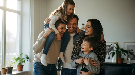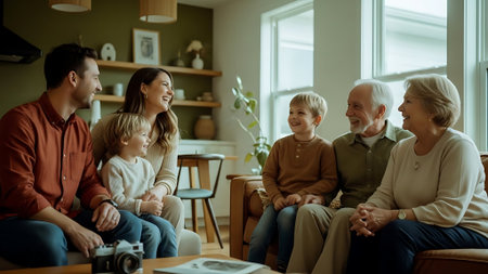 A cheerful group of family members sharing laughter and warmth in a cozy living room. The scene captures a moment of joy.