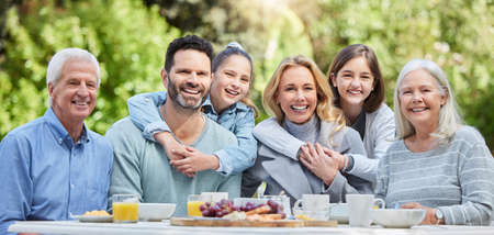 Multigenerational family sitting closely together outdoors, A portrait of a multi-generational family posing happily for a photograph