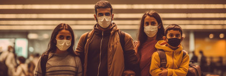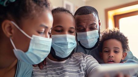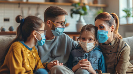 young family in medical masks during home quarantine.