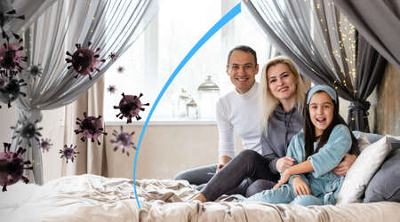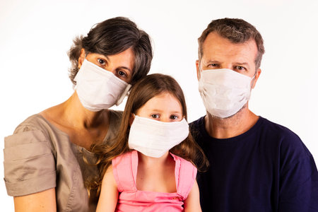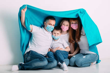 Family is wearing facemasks during coronavirus and flu outbreak. Virus and illness protection, quarantine. COVID-2019. A call to stay at home