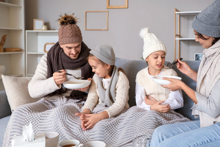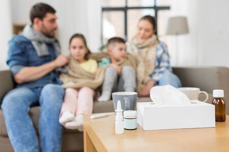 diseased family, wrapped in blanket, sitting on sofa near table with medicines