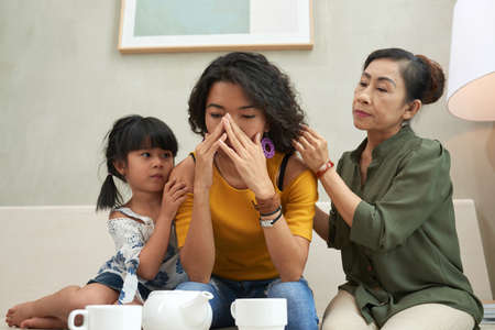 Son and daughter supporting sick mother on sofa