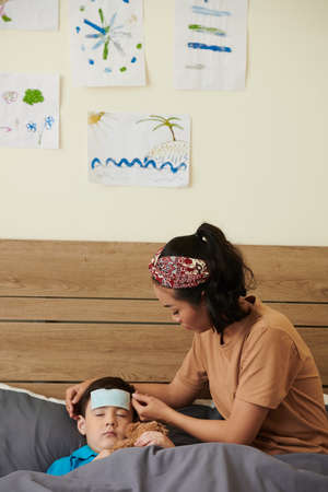 Serious Asian young woman putting cooling patch on forehead of son suffering from fever