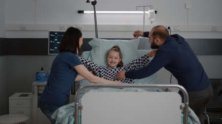 Happy young parents hugging hospitalized recovered little daughter while in pediatric clinic patient room. Cheerful family laughing and hugging in health pediatric hospital room.