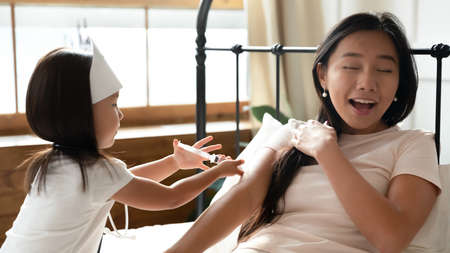 Little Asian girl pretending doctor vaccinating mother, cute toddler daughter kid using syringe, making prick, injection to funny scared mum lying in bed, family playing together in bedroom