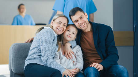 Portrait of the Young Happy Family in the Hospital. Handsome Father, Beautiful Mother and Cute Little Daughter Sitting in the Lobby of the Medical Facility, Smiling.