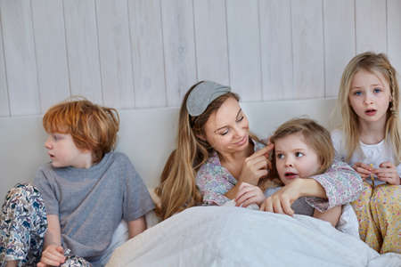 Mother and children together in bed