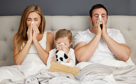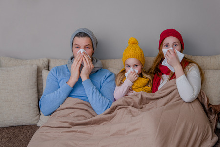 Flu season. a family blowing their noses while sick at home.