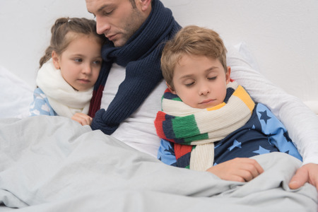 Sick father with children lying in a bed with scarfs over necks