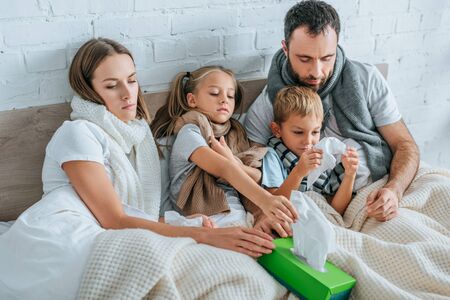 diseased family taking napkins while lying in bed together