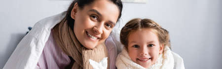 sick mother and daughter in scarfs smiling at camera under blanket, banner