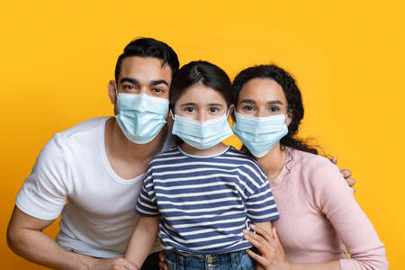 Portrait Of Happy Arab Family With Little Daughter Wearing Protective Medical Masks
