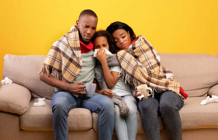 Flu season concept. Sick black parents and child girl feeling unwell, sitting together on sofa over yellow background