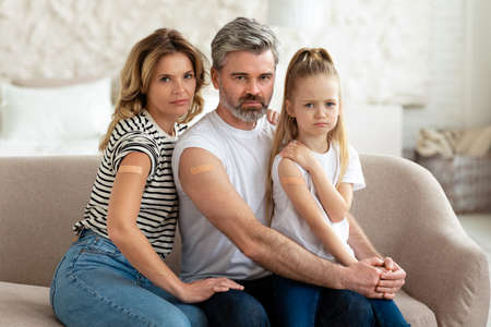 Displeased Vaccinated Family Showing Arms With Adhesive Bandage At Home