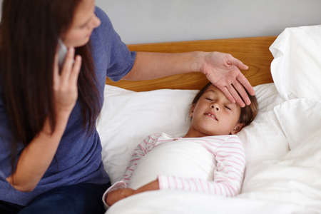 Time to call the doctor. Shot of a mother calling the doctor while sitting by her sick little girl.