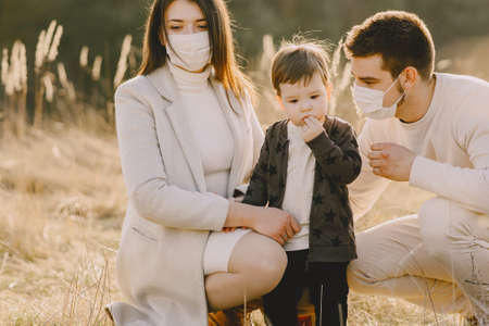 Stylish family in a masks walking on a spring field