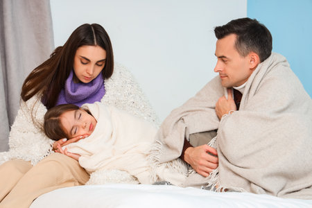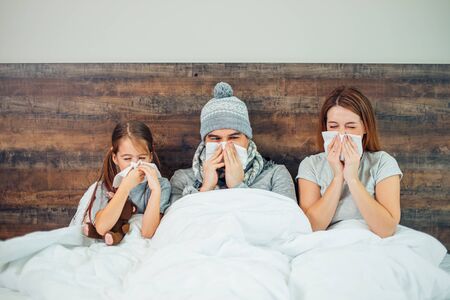 ill caucasian family lying on bed together, suffering from disease. Unhealthy man, woman and child girl treating at home