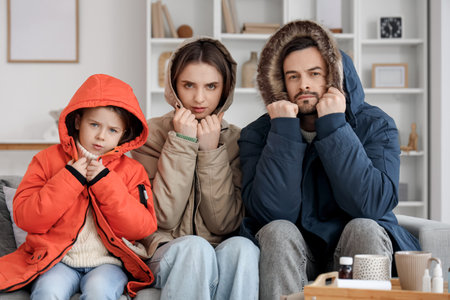 Frozen family in winter clothes sitting on sofa with lack of heating at home
