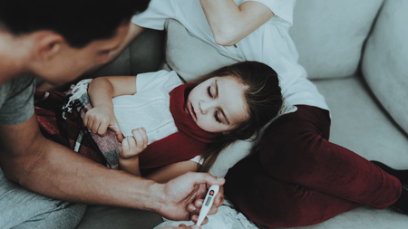 Little Girl in Red Scarf with Cold with Family. Sick Young Girl. White Sofa in Room. Father and Mother. Disease Concept. Healthcare and Healthy Lifestyle Concept. Take Care of Daughter.