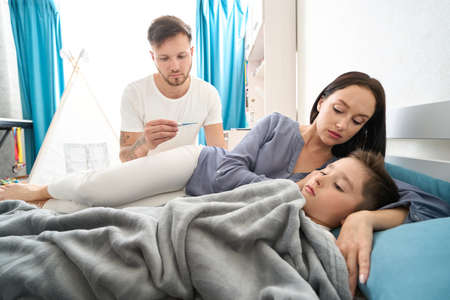 lovely careful family take care of sick daughter on bed, caucasian family at home treating ill kid girl