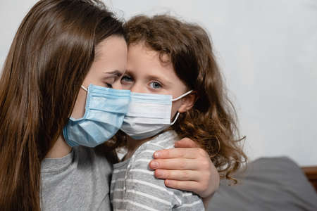 Close up portrait of mother embracing upset little curly daughter with virus mask, sitting on bed at home, consoling sad preschool girl. Concept of coronavirus or COVID-19 pandemic disease symptoms