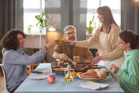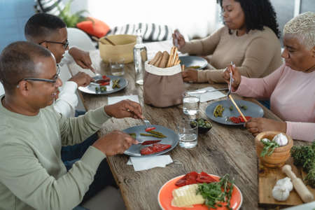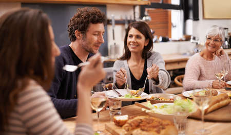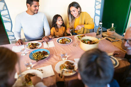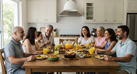 Storytelling image of a Family reunited at parents house for lunch on the holidays. Family members celebrating at home eating good food, sharing love and positive emotions.