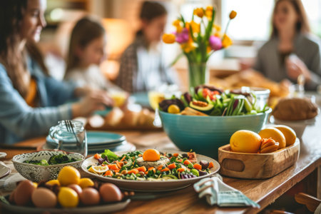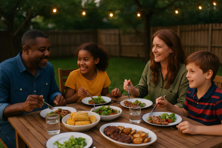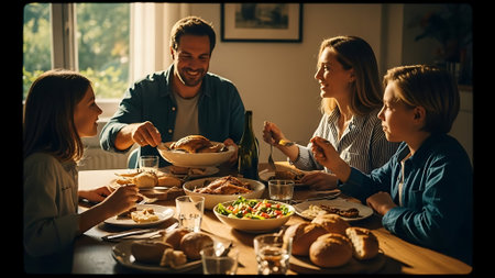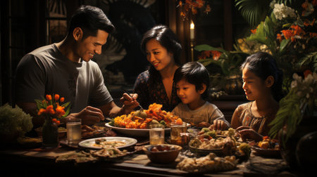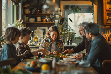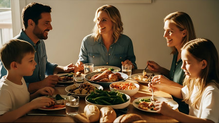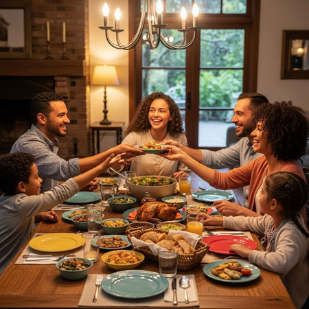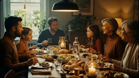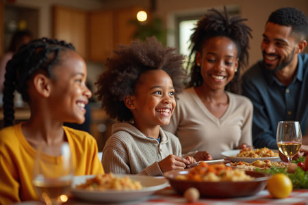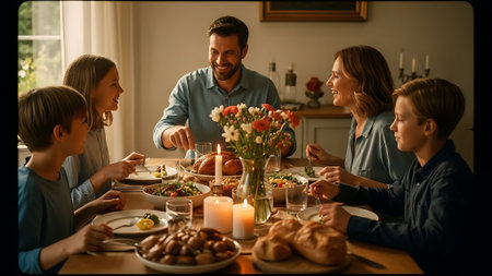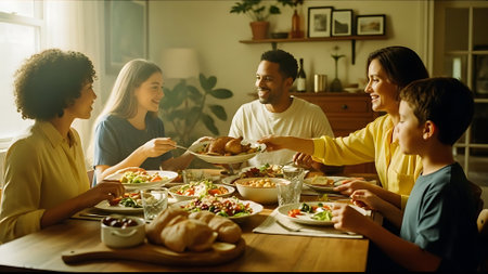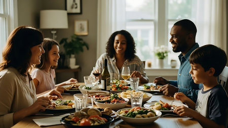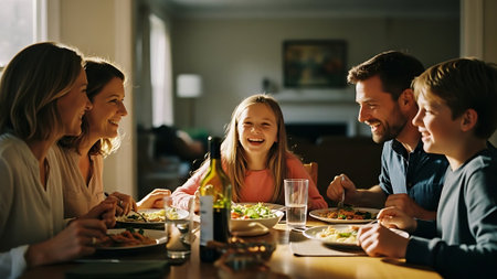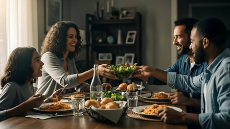 Joyous family gathers around the dinner table, sharing food and laughter in a cozy home setting