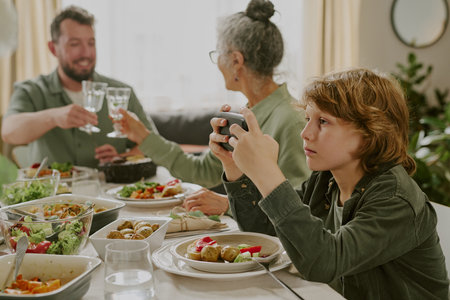 Caucasian boy sitting at dining table holding smartphone while middle aged Caucasian man and senior Caucasian woman clinking glasses in background, sharing family meal together