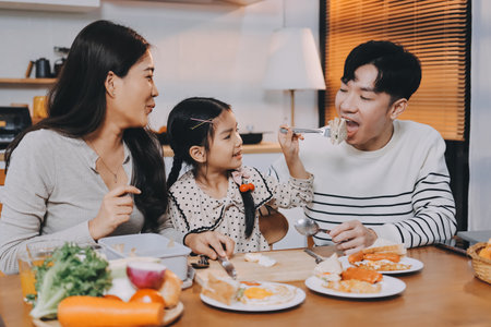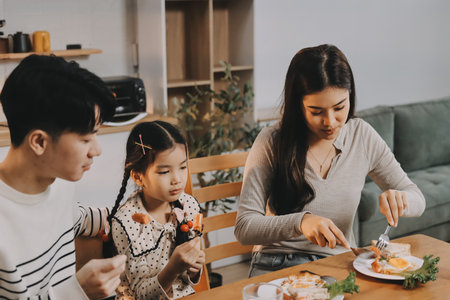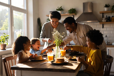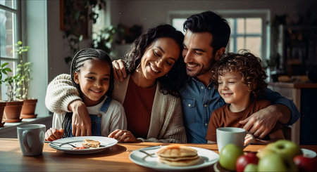 Family enjoying a joyful breakfast together at home with sunlight illuminating the cozy dining area in the morning