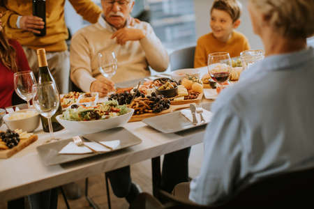 Portrait of happy big family celebrating having fun and lunch together enjoying spending time together at home