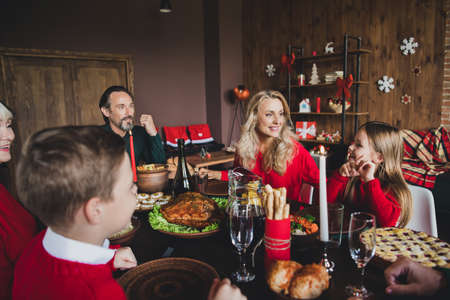Photo of full family gathering sitting around dinner table communicating x-mas party tradition all together son daughter grandma grandpa in noel decorated living room indoors