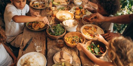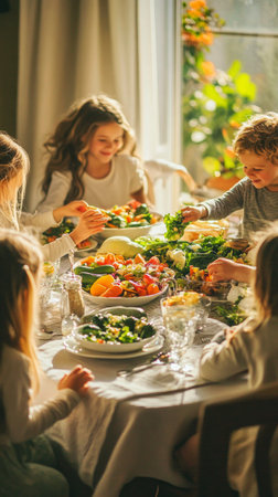 A family gathering around the dinner table, with kids enthusiastically helping serve a fresh vegetable salad, celebrating healthy eating, nourishing their bodies