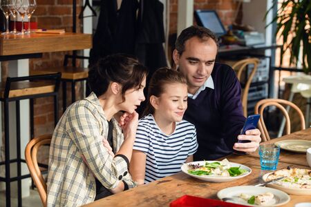 Happy family having dinner together at home. Mother, father and son spending time together.