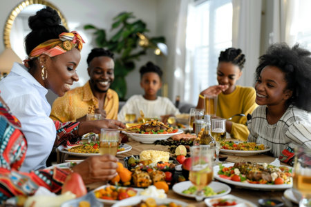 African family in national costumes sitting at dining table and talking to each other, they celebrating Kwanzaa holiday