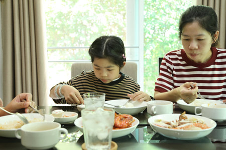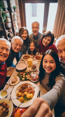 The Asian family gathered for a lunchtime reunion in the dining room, enjoying food together and sharing happy moments.