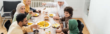 high angle view of happy multiethnic muslim family having dinner at home, banner