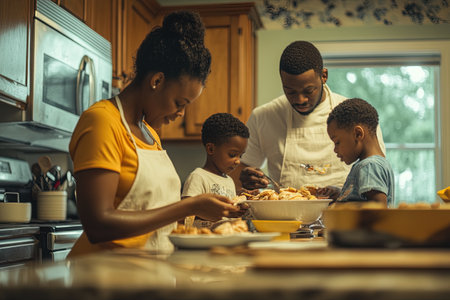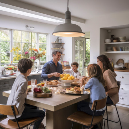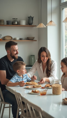 A joyful family of four shares a delightful meal in a sunlit kitchen, radiating warmth and togetherness. The scene captures the essence of family bonding, with laughter and love evident in their interactions as they savor delicious food.