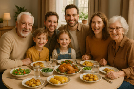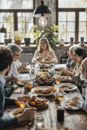 Smiling multi generational family gathering around a dining table, sharing a delicious meal and celebrating togetherness at home