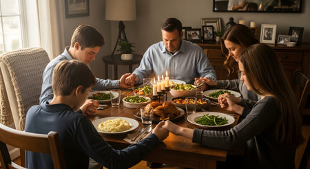 A family sits around a dining table holding hands and praying before a roast chicken dinner. The scene is illuminated by candlelight, evoking feelings of gratitude, faith, and togetherness during a holiday or special meal.