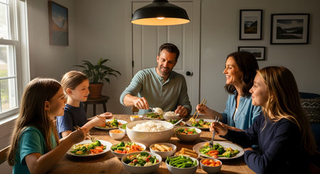 A smiling family of five enjoys a healthy dinner together at a round wooden table, sharing bowls of rice and vegetables. The scene captures the joy of family bonding, communication, and shared meals in a warm home environment.