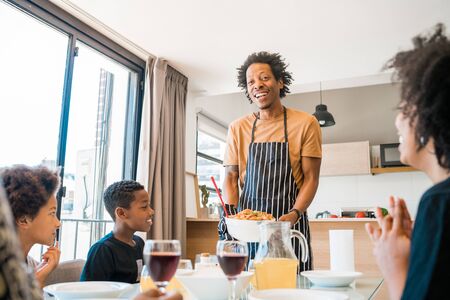 Portrait of African american family having lunch together at home, father cooked lunch for family. Family and lifestyle concept.