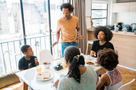 Happy family having breakfast in the kitchen at home. Multiethnic group of people having dinner together.