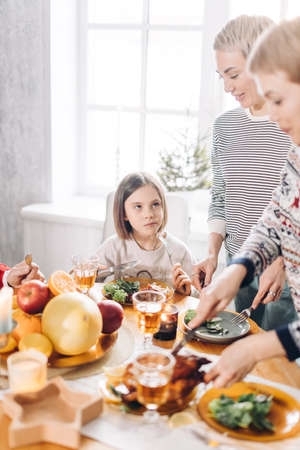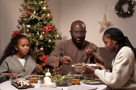 Young woman holding bowl with food while her husband taking piece of meat during family dinner on Christmas day