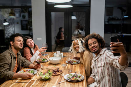 African young man making selfie portrait on mobile phone with his friends while they sitting at dining table during home party in the kitchen