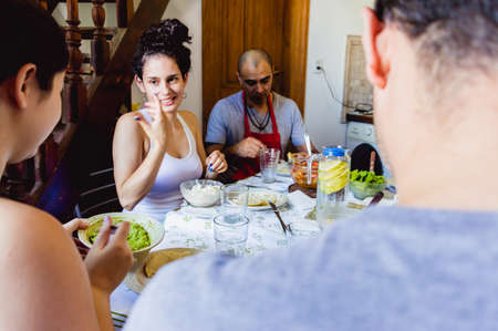 young caucasian people enjoying and eating as a family in the dining room of the house, with bowls of guacamole, arepa, cheese and vegetarian food on the table, lifestyle concept.